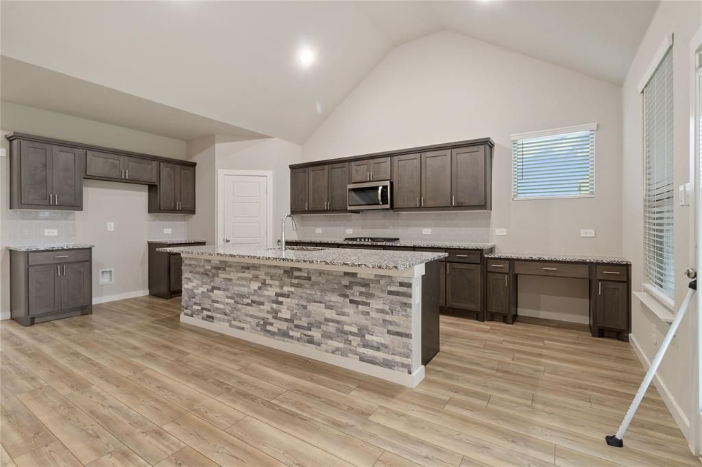 Nestled in the heart of the charming Oakmont Park community, this new-construction (built in 2022) impresses with both its amount of living space and its sophisticated curb appeal. The brick-clad facade, framed by a covered front porch, greets you warmly and sets a tone of modern elegance. Inside, soaring ceilings and an open-floor plan connect a gourmet kitchen equipped with stone countertops, gas cooktop, and a center island, seamlessly flowing into a dramatic family room perfect for gathering and entertaining. This thoughtfully designed two-story home offers five generously sized bedrooms and four full baths, including a luxurious primary suite on the first floor with double vanities. Beyond the interior, the corner lot delivers a smartly designed layout with a covered patio, wood fencing, gutters, and a classic two-car front-facing garage. It's an ideal home that effortlessly balances open social spaces with private retreats, all wrapped in energy-efficient, modern living.